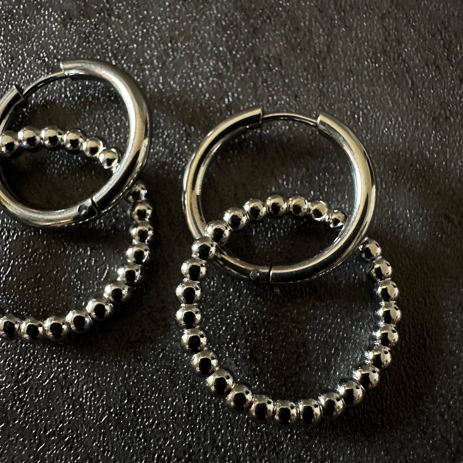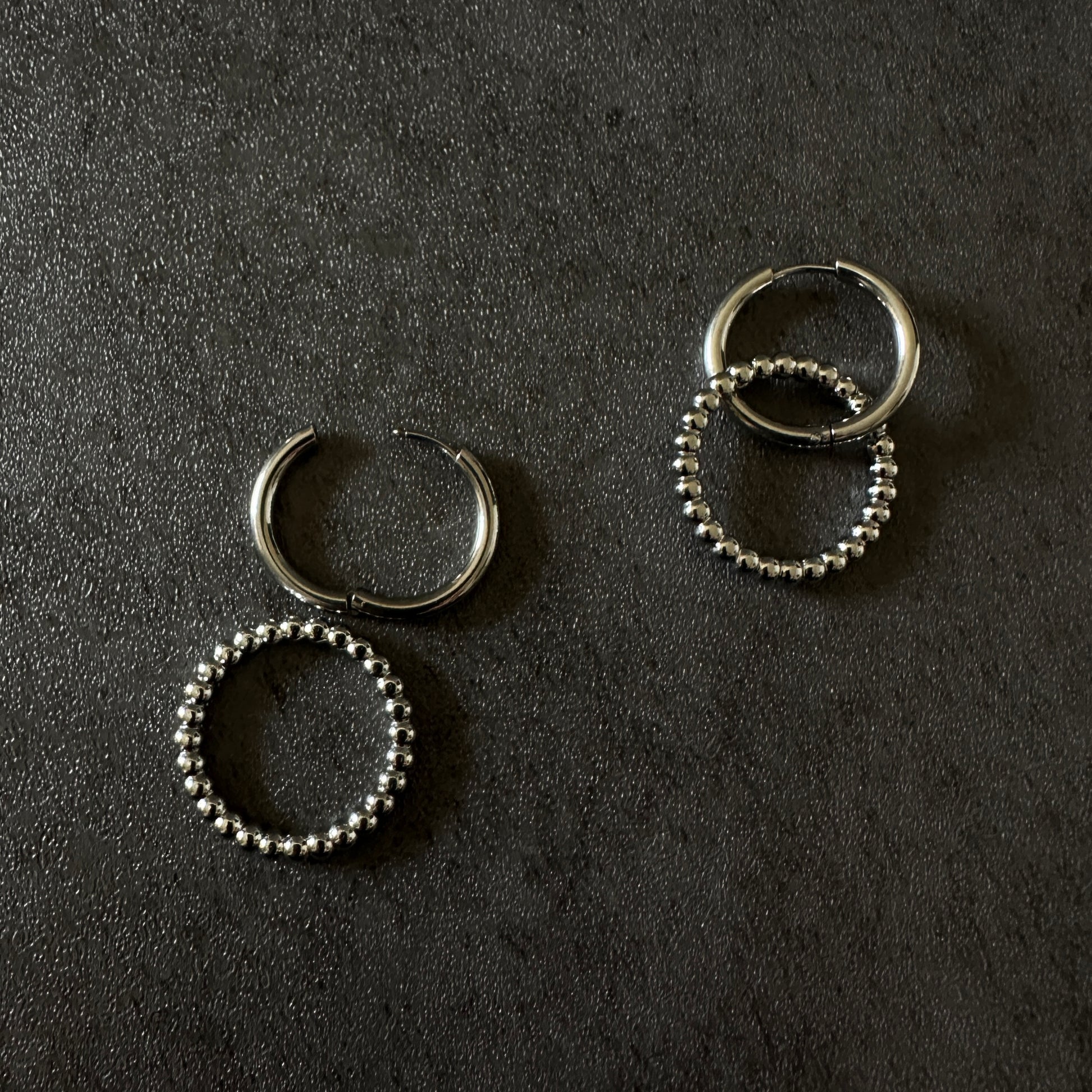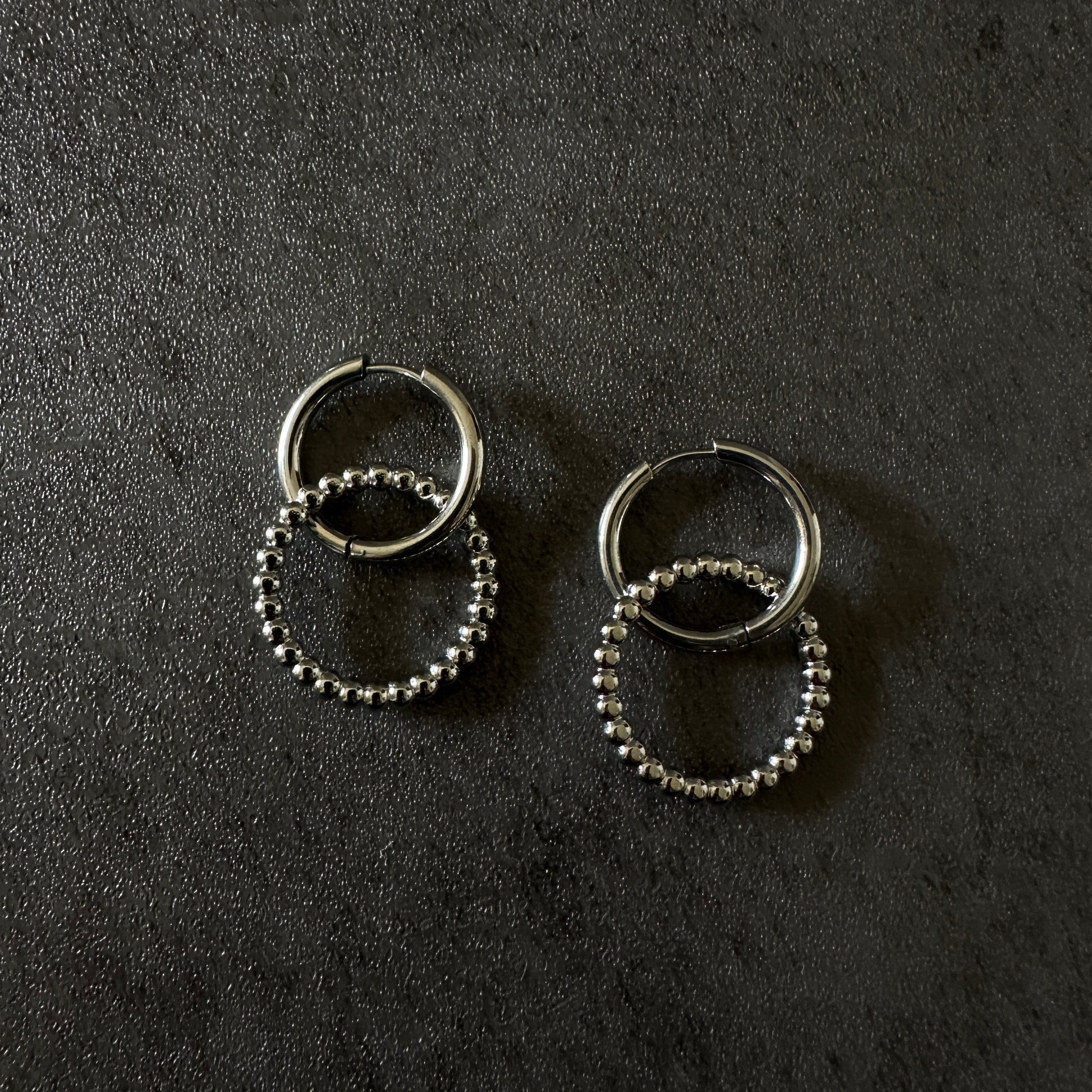 動くたびに揺れて女性らしさを演出してくれるダブルリングのフープピアス。ドットリングを外してシンプルなフープピアスにもできる2way使用。