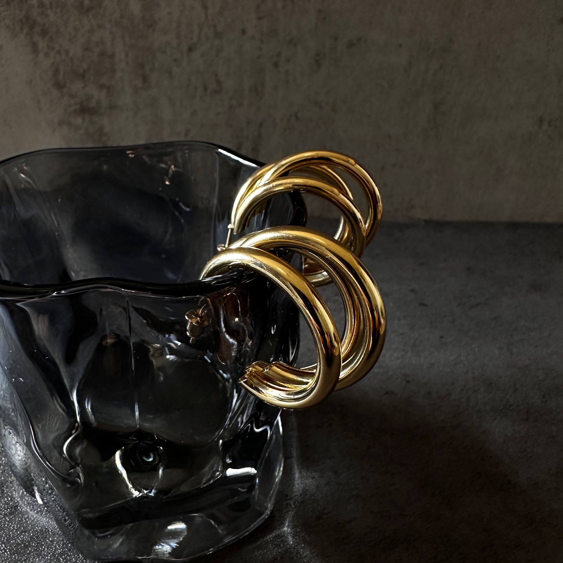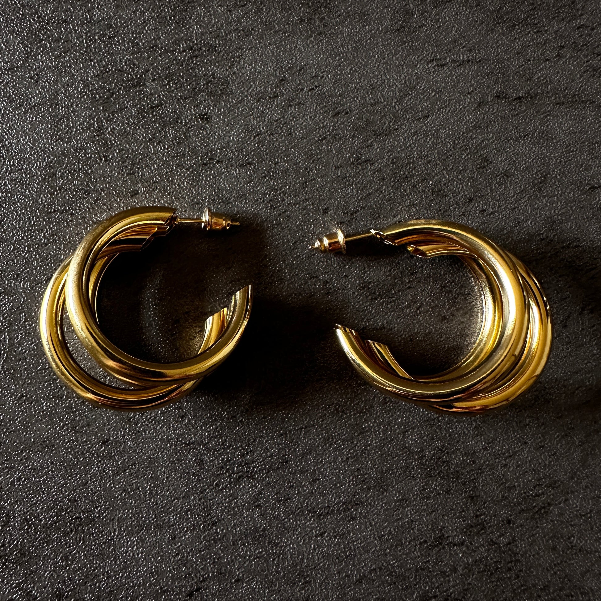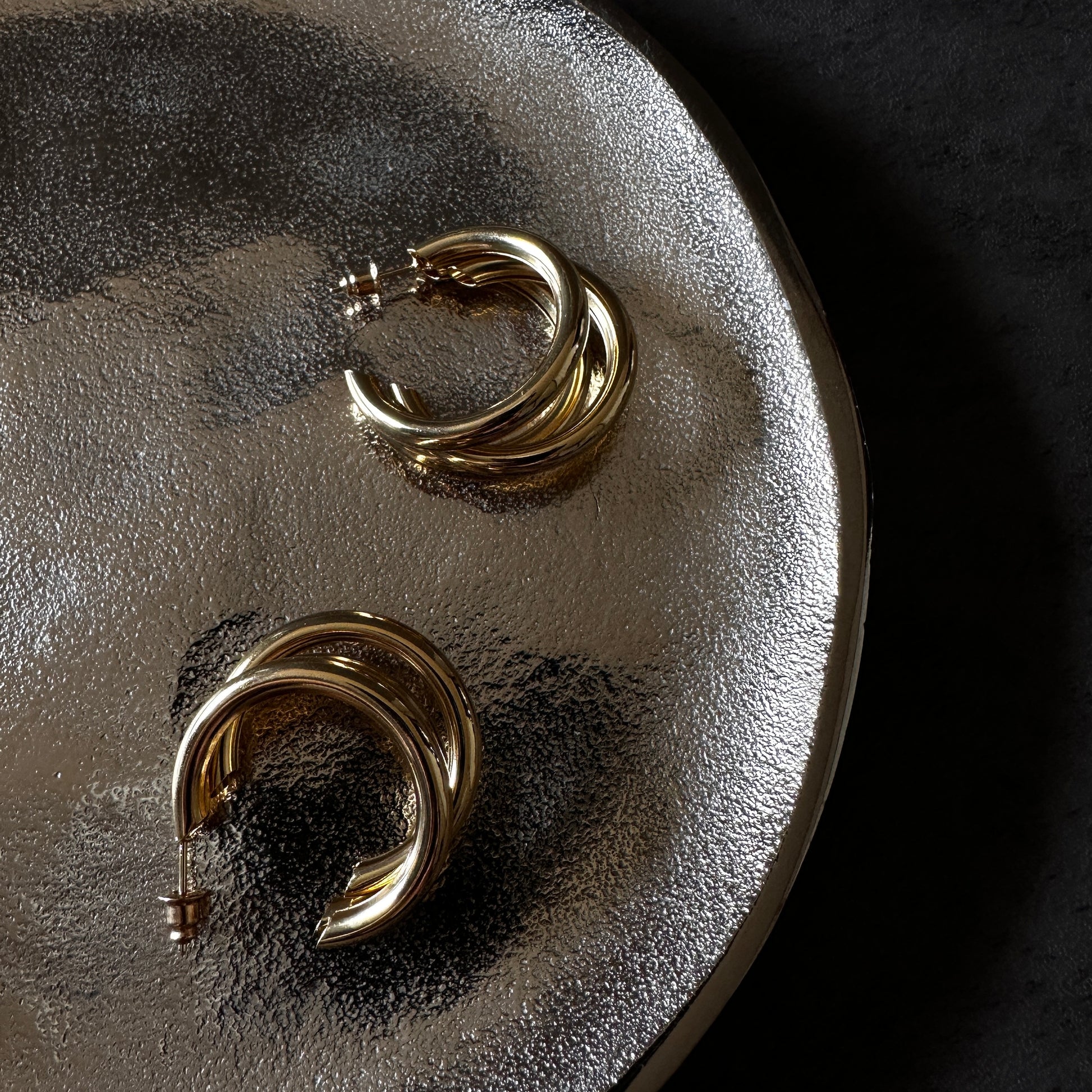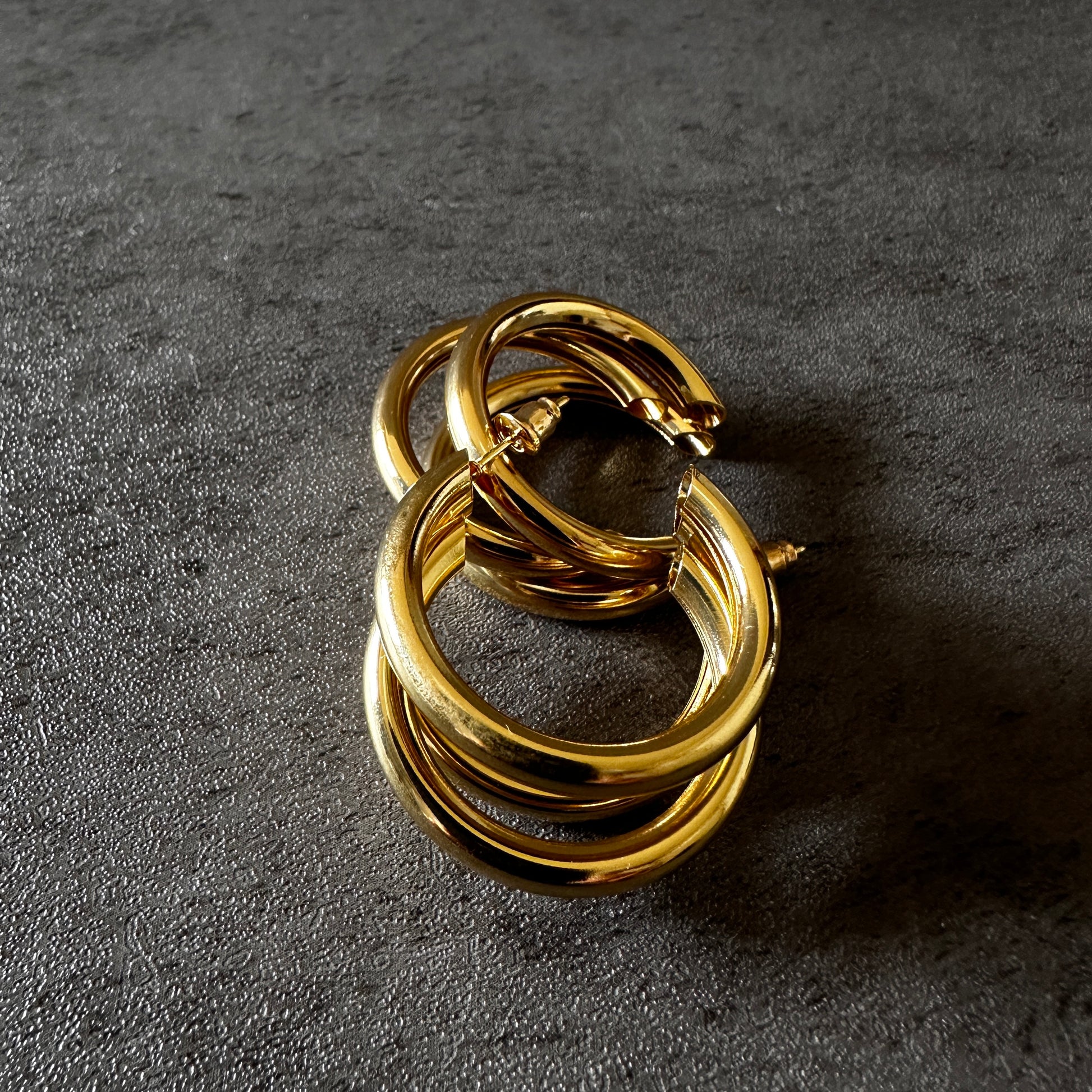 しっかりと存在感のある、大きめの3連ピアス。カジュアルにも、オケージョンスタイルにも!